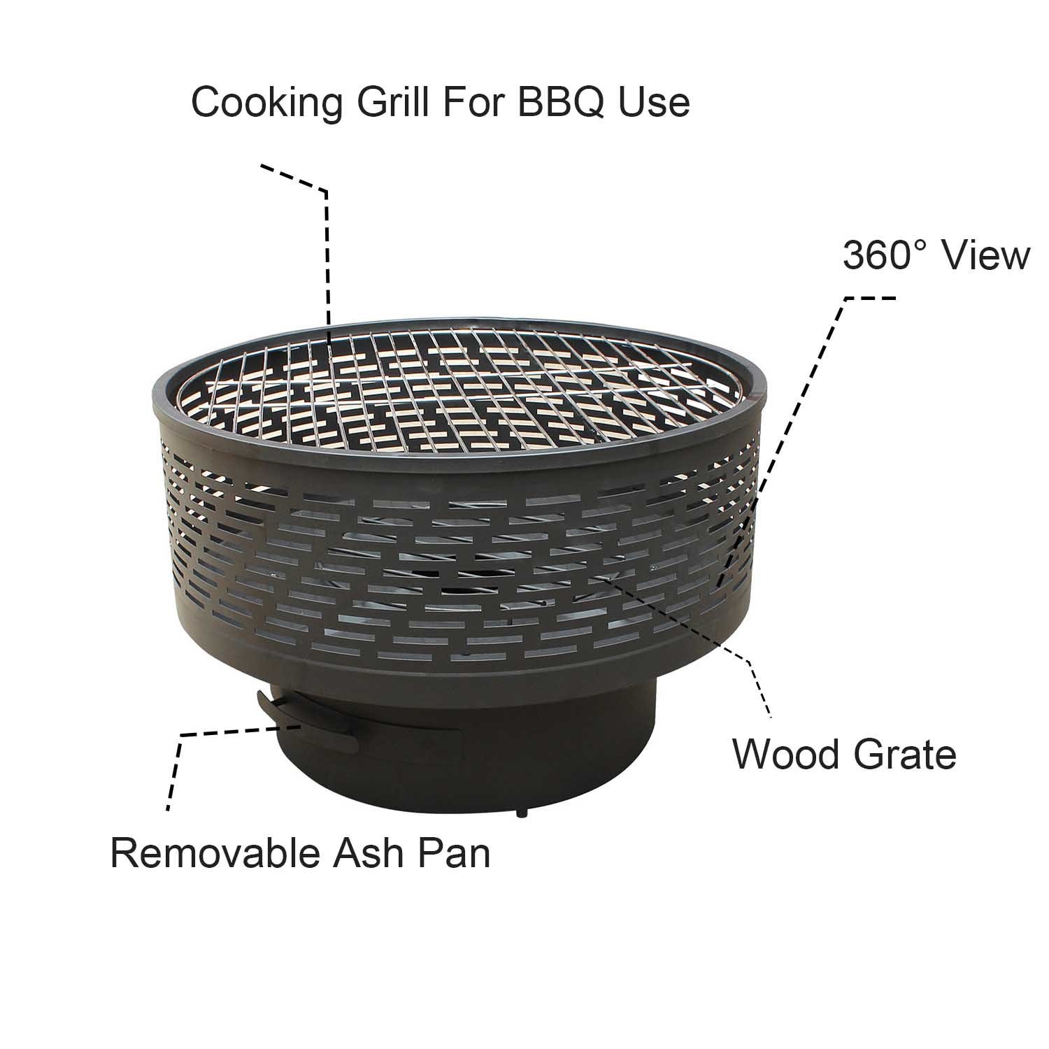 Versatile Functionality:1.with cooking gril for BBQ use.2.360°view and airflow .3.fire bowl inside with wood grate4.removeable ash pan easy to clean.