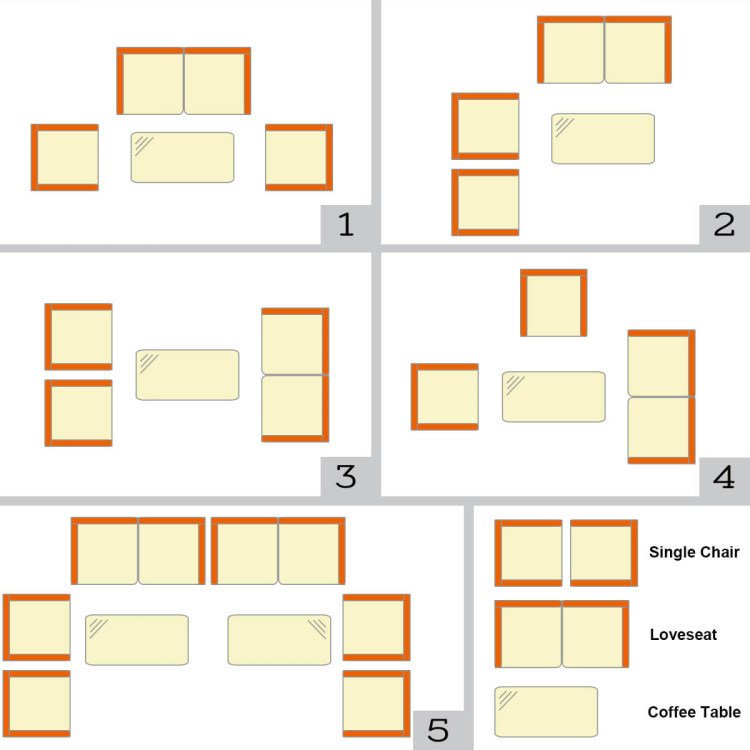 -Package includes 2 single sofas; 1 loveseat; 1 coffee table; 3 seat cushions and instruction