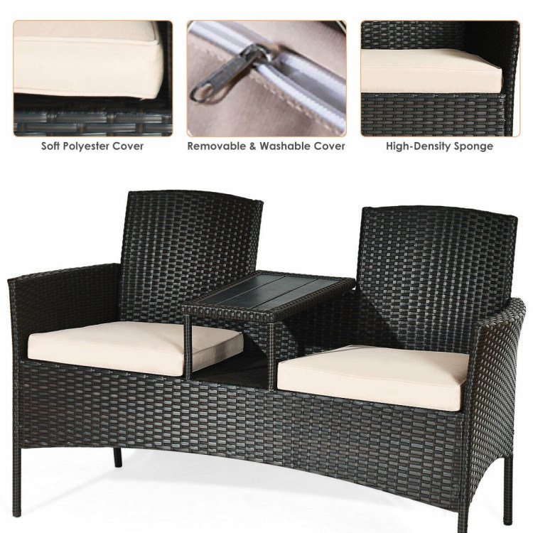 4.Wide Applications of Unique Style: This outdoor loveseat sofa set in modern and chic style is great for patio, porch, backyard, balcony and poolside. Besides, with built-in coffee table between 2 seats, this patio loveseat sofa is compact and great for small space.